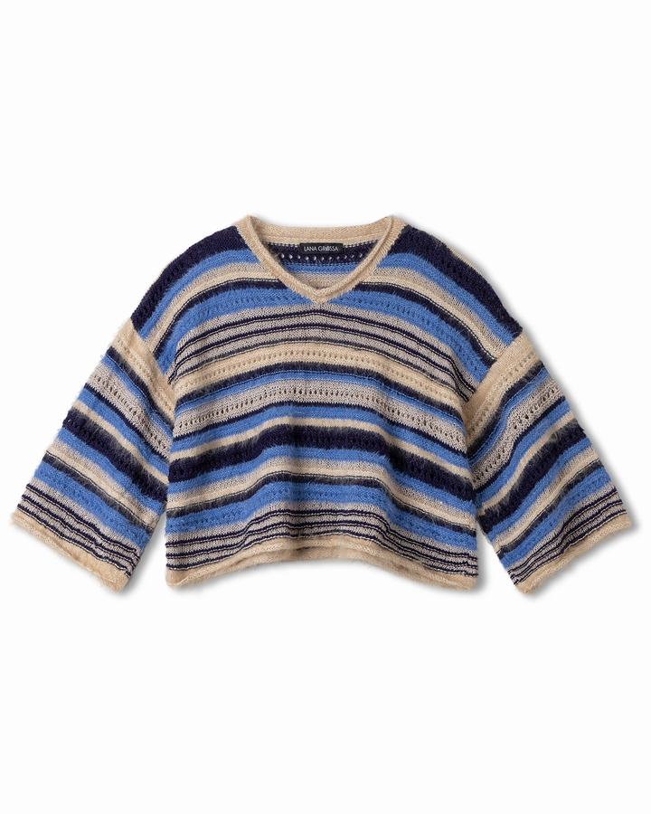Lana Grossa Finito (73% Baumwolle, 27% Polyamid, LL = ca. 200 m/50 g), 150 (200 - 250 - 250) g in Camel/ Creme (Fb 26). Lana Grossa Per Fortuna (74% Baumwolle, 26% Polyamid, LL = ca. 150 m/50 g), 100 (100 - 150 - 150) g in Veilchenblau (Fb 62). Lana Grossa Filo Paillettes (55% Baumwolle, 39% Polyester, 6% Polyamid, LL = ca. 155 m/50 g), 100 (150 - 150 - 200) g in Hellbeige (Fb 18). Lana Grossa Tencellino (51% Leinen, 49% Tencel, LL = ca. 125 m/50 g), 150 (200 - 250 - 250) g in Nachtblau (Fb 18).