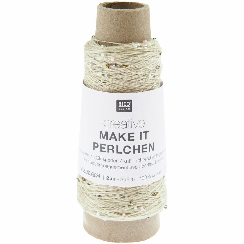 Creative Make It Perlchen besteht aus 100 % Lyocell und ist mit eingearbeiteten Glasperlen versehen. Das Beilaufgarn kann gemeinsam mit anderen Garnen verstrickt oder verhäkelt werden, ohne dass sich die Anleitung verändert, da es einfach mitläuft. Der Faden ist verzwirnt, wodurch sich die Glasperlen nur leicht entlang des Garns verschieben können und Textilien eine dezente Struktur sowie Akzentuierung erhalten.